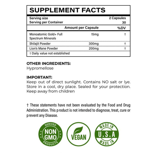 I Am Joy co. Ormus Shilajit Lion's Mane - Ultimate Brain Power! Monoatomic 24k Gold - The Only Blend of Its Kind for Energy, Memory, & Focus - 60 Vegan Capsules in Eco Friendly Glass